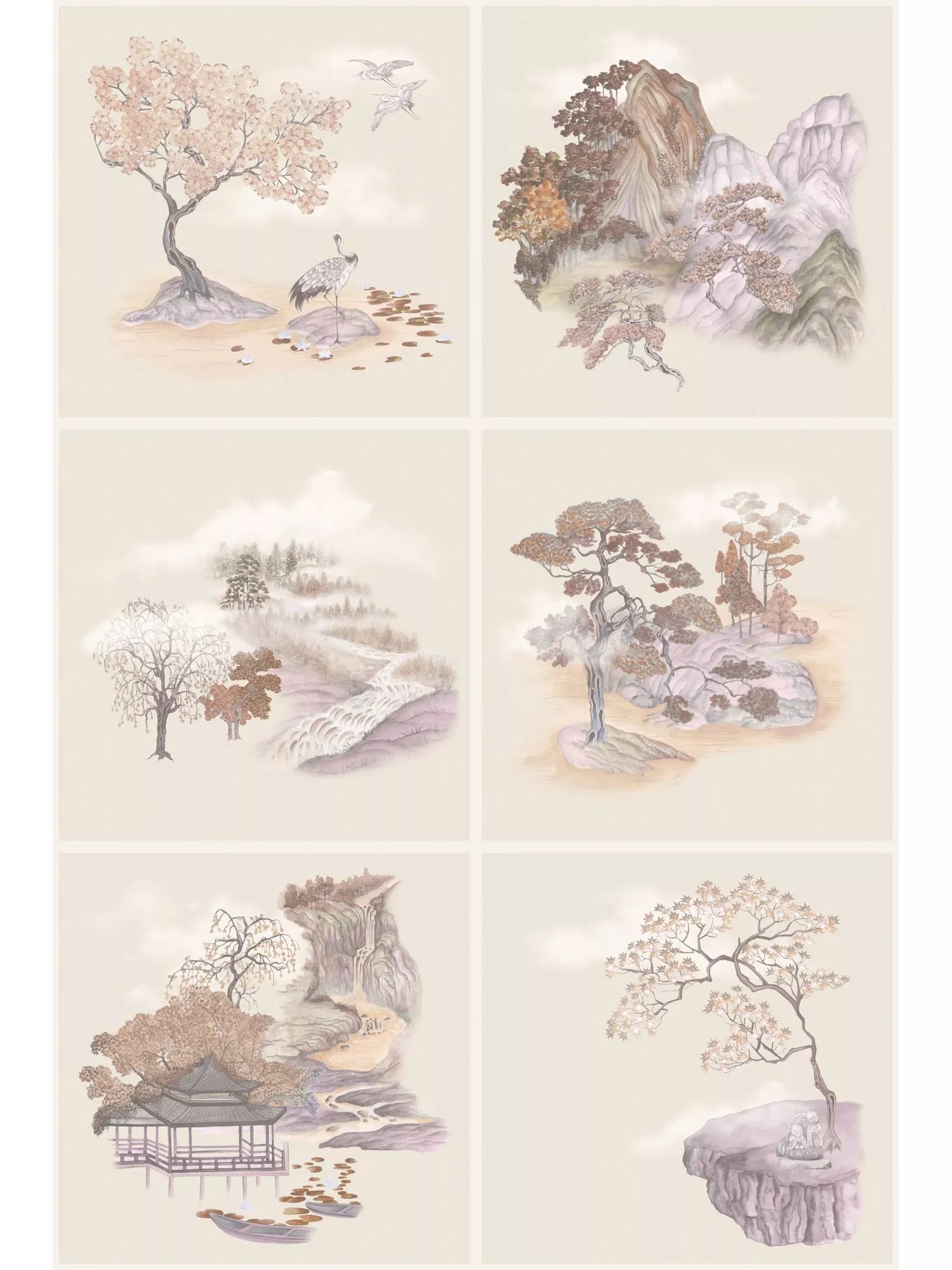 Connected to Cole & Son's Pavilion and Mountainscape wallpaper designs, Tile Toile depicts key scenes that were inspired by the beautiful landscapes of Silver Pavilion in Kyoto. The tile-like structure of the design mirrors traditional Japanese wall art and flirts with a Toile de Jouy. Each tile depicts a still life scene, however when viewed as one, it tells a harmonious story of the historical gardens.