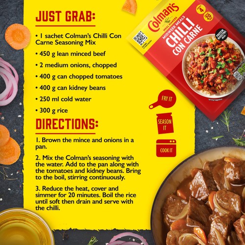Colman's Chilli Con Carne Meal Maker helps you create hearty midweek meals for the family easily. This seasoning blend features paprika, cumin, and cayenne pepper for a rich, authentic flavour profile. With this mix, you can serve a flavourful meal ready in just 20 minutes following simple preparation steps.