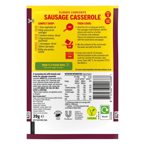 Colman's Sausage Casserole Meal Maker simplifies creating hearty comfort food for the family. This packet contains a precise blend of herbs and spices designed to deliver rich flavour effortlessly. When paired with fresh sausage, onions, and mushrooms, preparing a satisfying meal is straightforward.