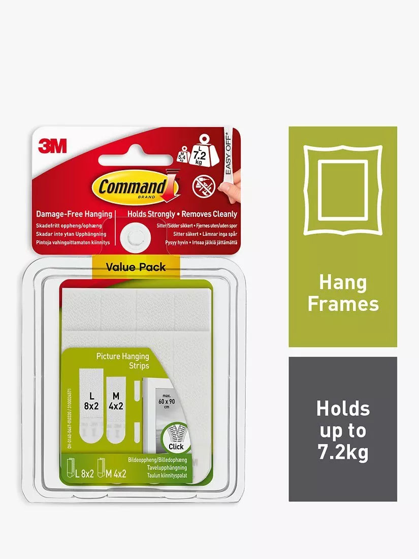 Simply apply four hanger strips to each side of your picture frame. The strips provide grip and security, without being visible. If you need to move, take down your pictures or when you're decorating, the strips remove cleanly, leaving no nail holes or sticky residue on your wall. The strips lock and relock so your frame can be removed and repositioned until it's just right.