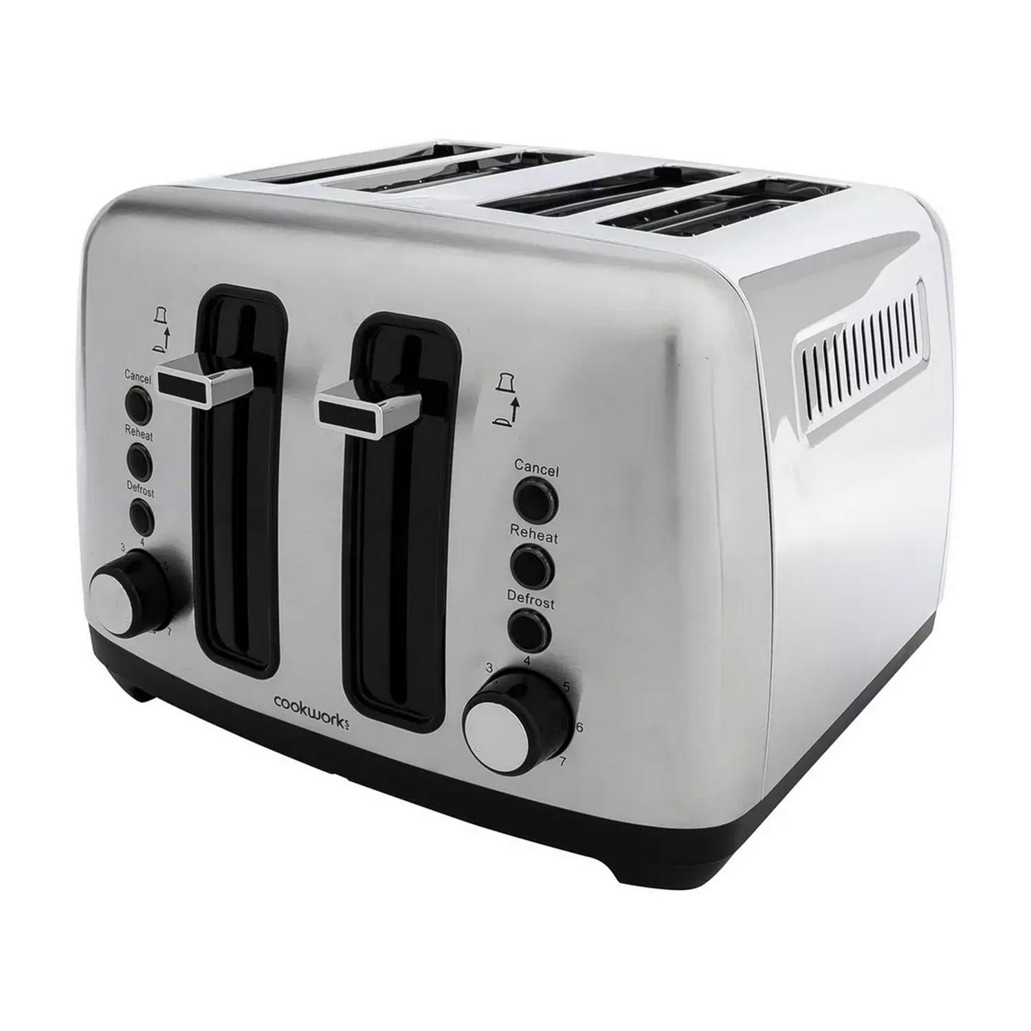 Read MoreCrunch. Munch. Enjoy 7 levels of toastiness with this Cookworks stainless steel 4 slice toaster. Features defrost, reheat and cancel options. Plus a crumb tray to keep things tidy. And a high lift function to make popping smaller slices out easy.