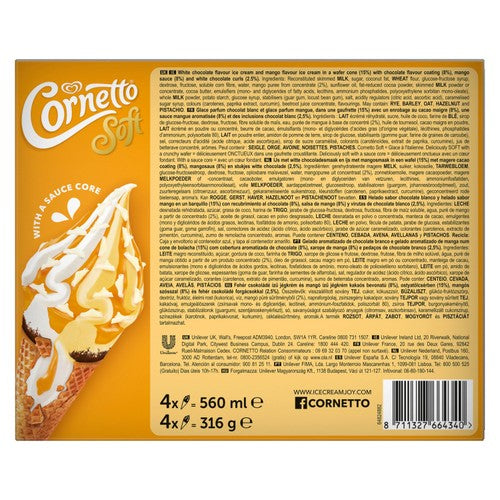 Cornetto Soft Mango & White Chocolate is a softer, smoother version of Cornetto ice cream topped with a vibrant mango sauce in a crunchy wafer cone, Crispy baked wafer coated from top to bottom with a chocolatey layer, wrapped around tropical mango and white chocolate ice cream, with white chocolate curls and a delightfully tangy sauce core, What's sweeter than anticipation? Look forward to Cornetto's legendary chocolatey tip at the base of every ice cream cone - double the enjoyment with every mouth-watering bite!, When creamy meets crunchy, the fun sparks - you just can't beat the irresistibly tasty combo of smooth ice cream, a crunchy cone and a deliciously chocolatey tip, Our Soft Mango & White Chocolate ice cream comes in a pack of 4, perfect for a delicious snack or as a dessert, Thanks to our temperature-controlled delivery, your Cornetto ice cream cones will stay frozen until they reach your freezer