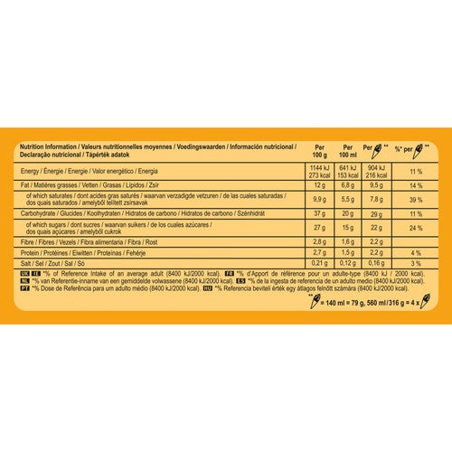 Reconstituted skimmed MILK, sugar, coconut fat, WHEAT flour, glucose-fructose syrup, dextrose, fructose, soluble corn fibre, water, mango puree from concentrate (2%), sunflower oil, fat-reduced cocoa powder, skimmed MILK powder or concentrate, cocoa butter, emulsifiers (mono- and diglycerides of fatty acids, lecithins, ammonium phosphatides, polyoxyethylene sorbitan mono-oleate), whole MILK powder, potato starch, glucose syrup, stabilisers (guar gum, locust bean gum), salt, acidity regulators (citric acid, ascorbic acid), caramelised sugar syrup, colours (carotenes, paprika extract, curcumin), beetroot juice concentrate, flavourings. May contain: RYE, BARLEY, OAT, HAZELNUT and PISTACHIO