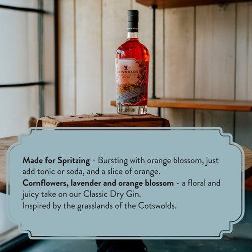 Made for Spritzing - Bursting with orange blossom, just add tonic or soda, and a slice of orange for a refreshing Gin Spritz, Cornflowers, lavender and orange blossom - No. 1 Wildflower starts as a London Dry base, to which we add essence of cornflower, lavender and orange blossom for a floral and juicy take on our Classic Dry Gin, Inspired by the grasslands of the Cotswolds - wilding and wildflower grasslands are a part of the agricultural way of life in the Cotswolds