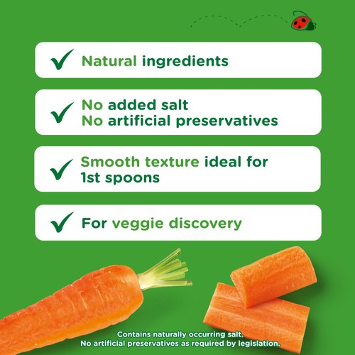 Cow & Gate Carrot Baby Food Snack Jar is carefully prepared for babies from four months old. This single-ingredient jar offers a simple, vegetable-based option as you begin introducing weaning foods. It focuses on quality ingredients suitable for early stages of feeding.
