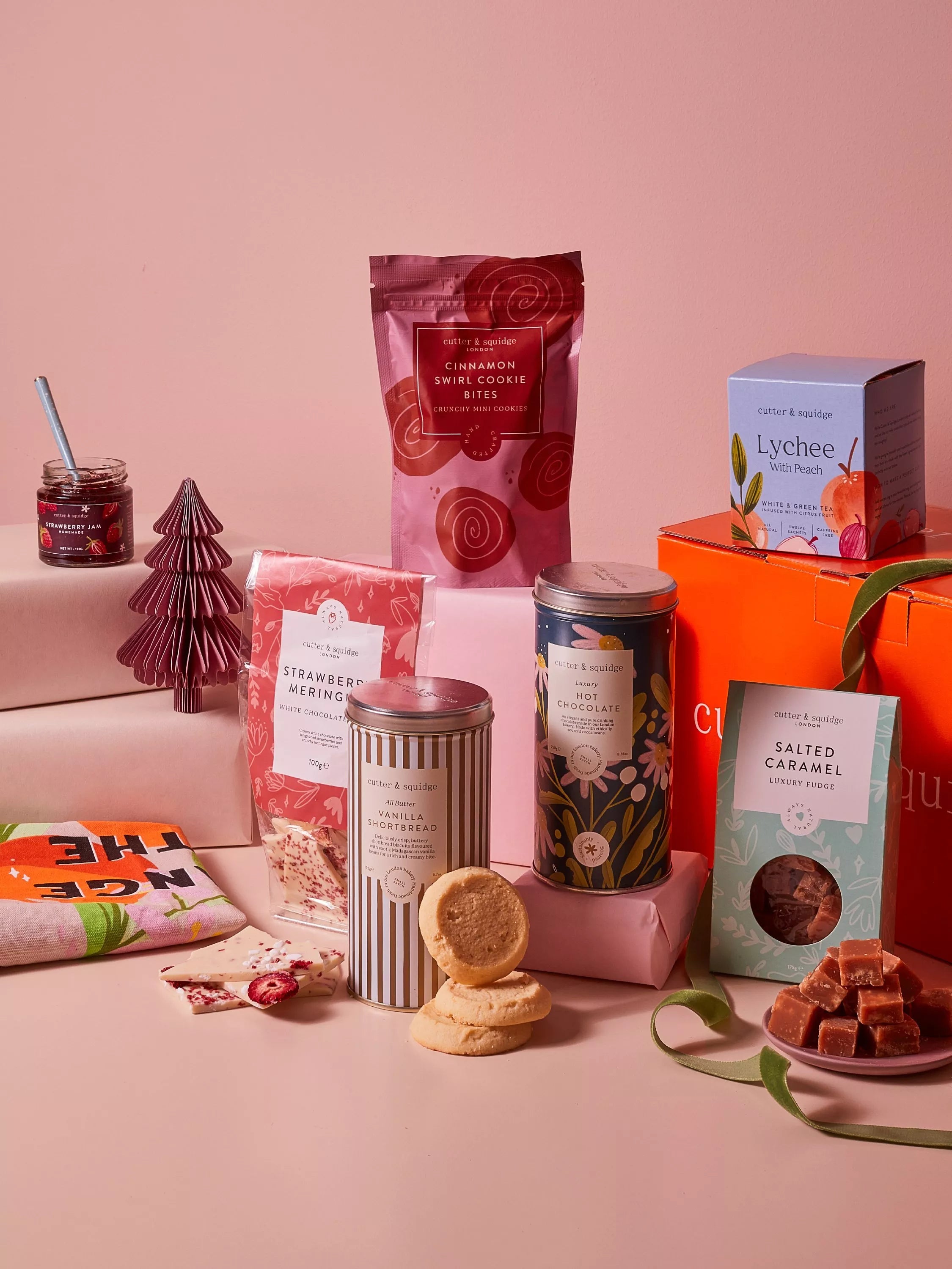 This tasty hamper is filled with a selection of sweet signature delights from Cutter and Squidge: Cinnamon Cookie Bites, Salted Caramel Fudge, Hot Chocolate, Lychee Tea, White Chocolate Strawberry Meringue Bark, Vanilla Shortbread and Strawberry Jam. Presented in a Cutter & Squidge gift box - tea towel included.