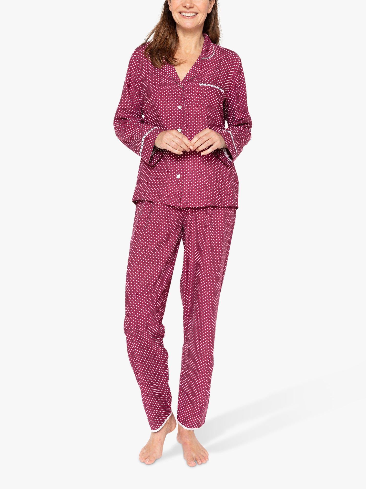 Cyberjammies Katherine Pyjamas offer a playful spot pattern set in a vibrant Magenta Mix. This comfortable, long-sleeve pyjama design uses a soft, blended fabric construction for all-night wear. The elegant white piped trim provides a classic, refined finish, making this set perfect for relaxing evenings.