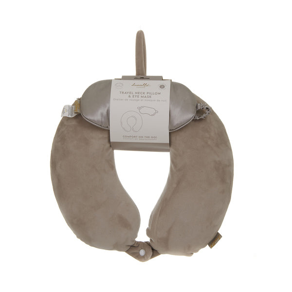 Soft U-shaped neck pillow Dimensions: 31W x 29H x 10D cm Matching fabric eye mask included Handy hook for easy carrying Ideal for flights, travel or home use Travel in comfort with the Danielle Creations Travel Pillow and Eye Mask Set in a soft grey finish. The U-shaped pillow is made with plush-touch fabric for a cosy, luxurious feel, offering gentle support to your neck and head—perfect for long journeys or resting on the go. It features a secure popper fastening to keep the pillow in place and a handy hook at the top, making it easy to attach to your bag or suitcase. The matching eye mask helps block out light for a more peaceful rest, whether you're on a flight, train, or simply relaxing at home. Lightweight and compact, this stylish set is a must-have travel companion.