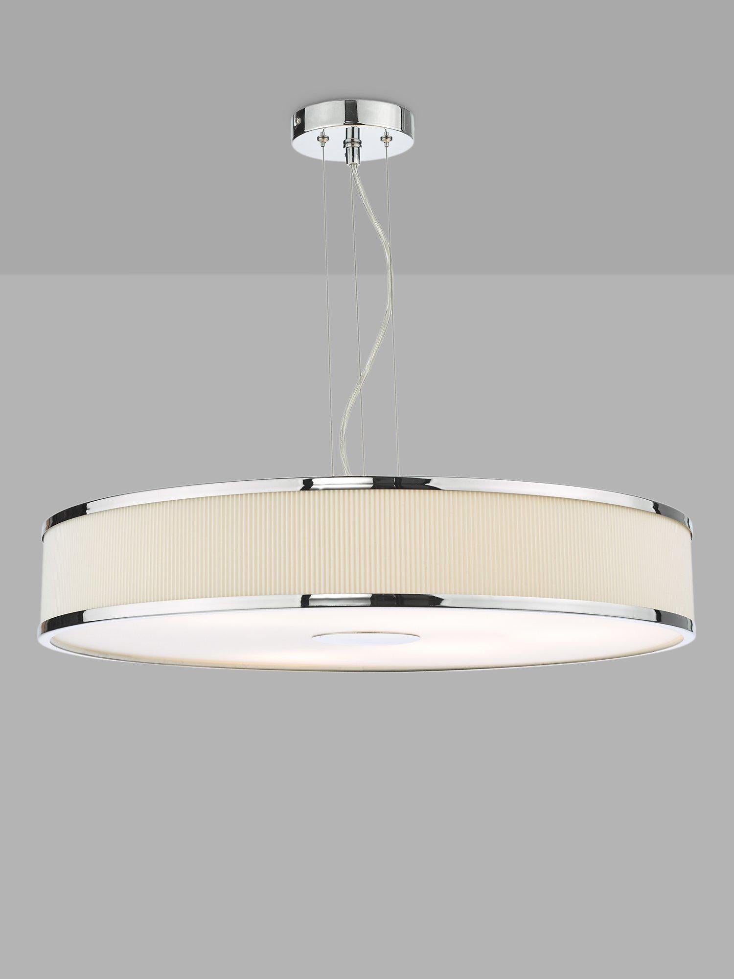 Read MoreSleek, slender and carefully designed to reduce glare, this ceiling light has a frosted diffuser at the top and bottom of the shade. Not only does it soften the glow and radiate a warm and even wash of light, it also keeps dust out and makes this a great choice for hanging low over a table or high in a bedroom. The lampshade is made from tightly pleated cotton in a selection of colours and it's accented with metal detail in an antique or polished finish. Plus, it's suspended from a height-adjustable cable, requires six LED bulbs and it's also available in a smaller size.