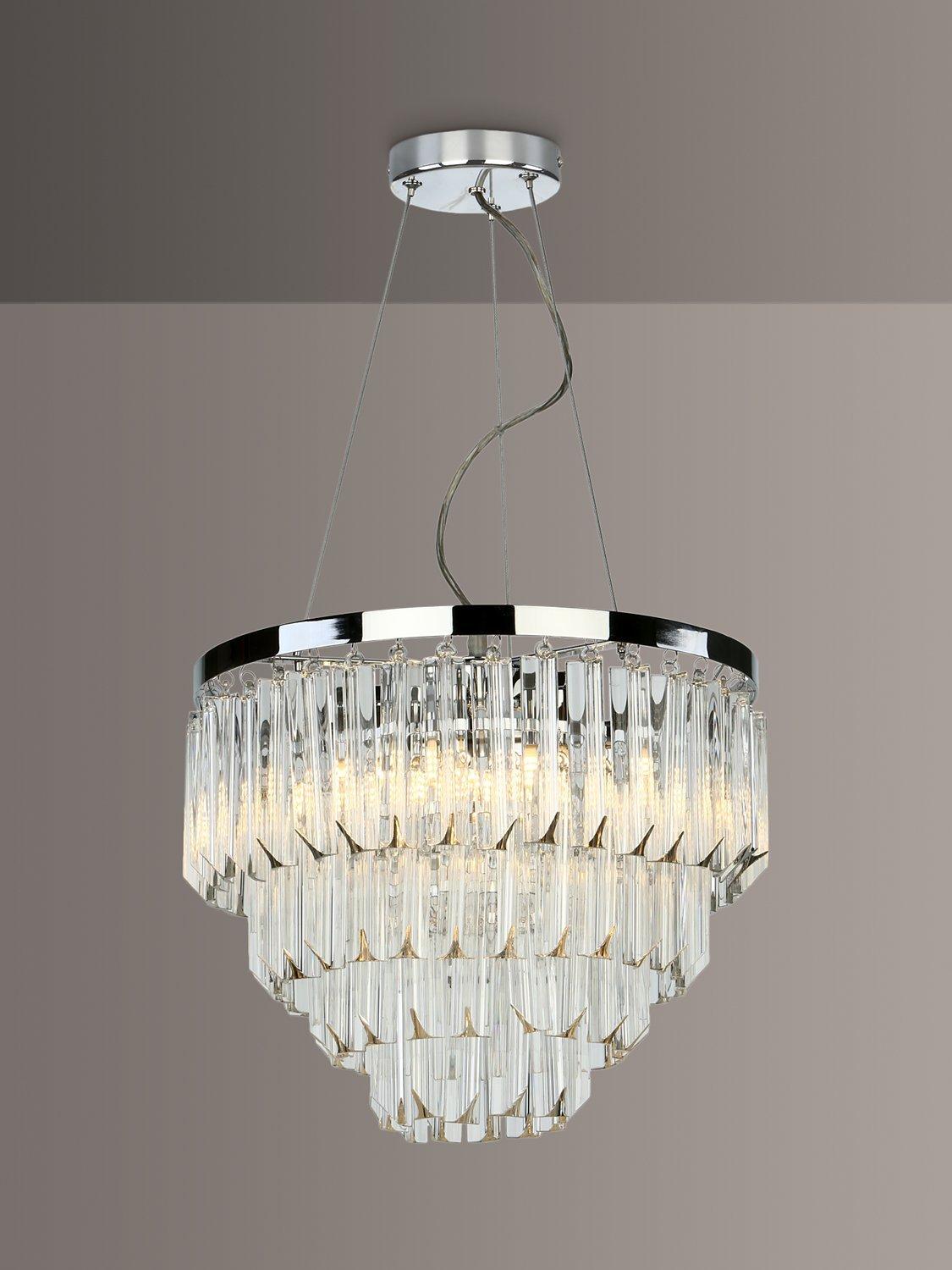 The Dar Ambient Crystal Chandelier Ceiling Light showcases striking Art-Deco inspired architecture for your home. Its tiered formation of clear glass crystals refracts light perfectly, achieving a wonderfully warm and inviting atmospheric glow within. The polished nickel base ensures this fixture adds sophisticated visual elegance to any main living area.