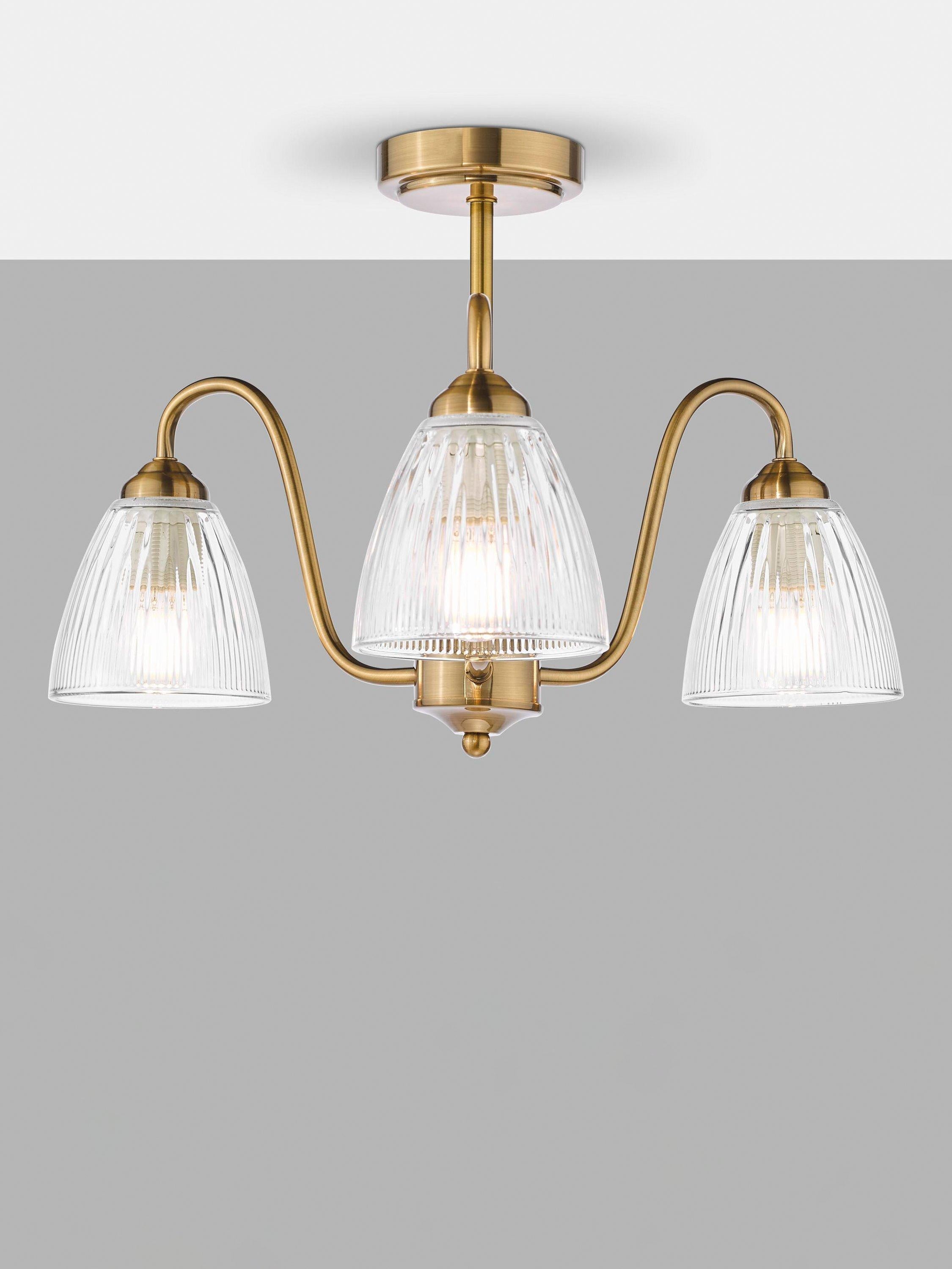 The Glynis 3 Arm Semi Flush Ceiling Light is ideal for lighting low ceilings. This traditional-style fixture features clear ribbed glass shades, adding texture and visual interest to any room. The Glynis semi-flush ceiling light creates a cosy ambience while providing ample illumination for your living areas.