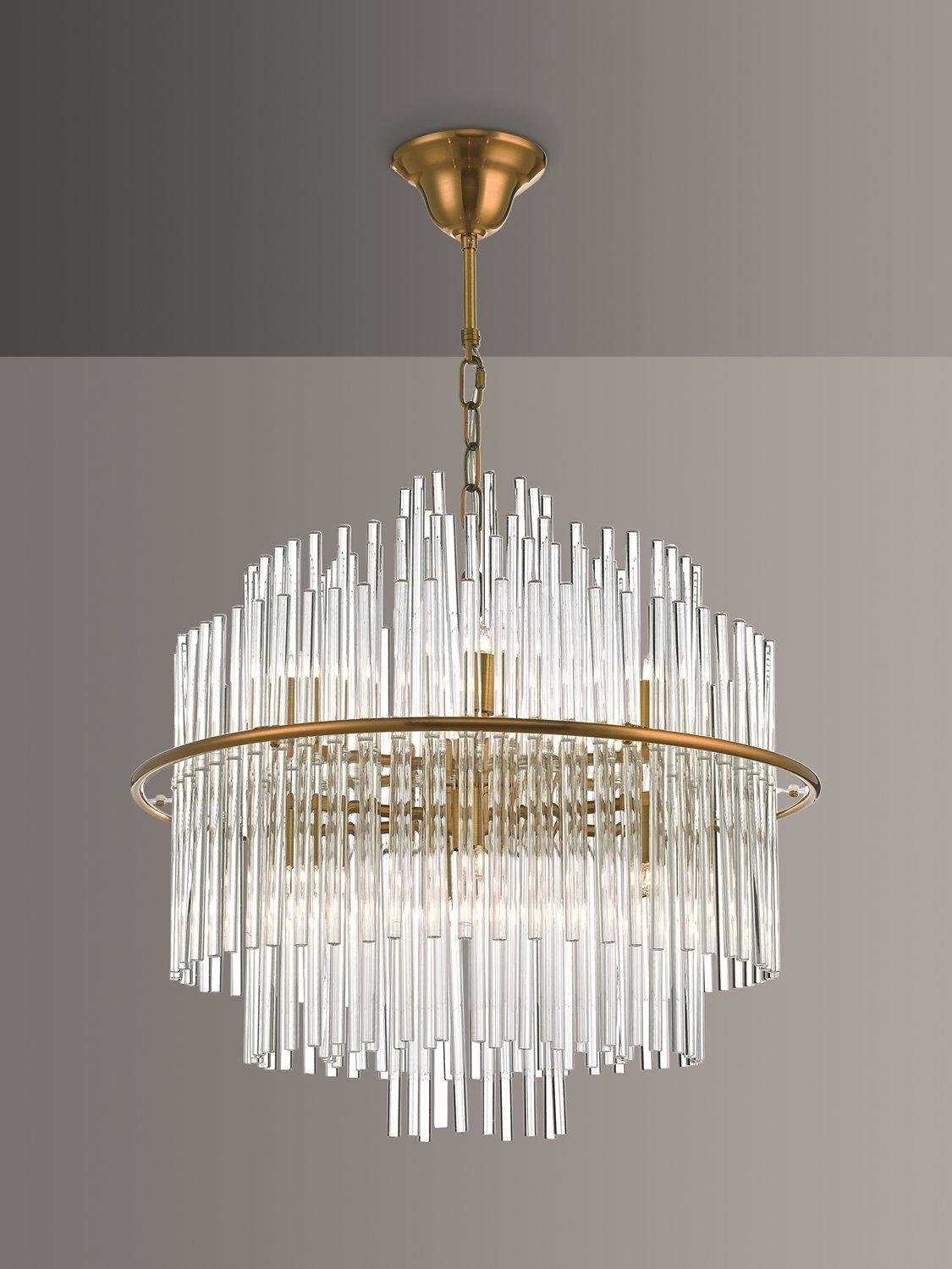 Dar Lukas Glass Ceiling Light provides dazzling Art Deco illumination via tiered glass rods. Supported by a strong metal frame, this fixture is height-adjustable for specific placement needs. It adds sophisticated visual interest to your home decor instantly. This elegant piece guarantees a strong design statement in any interior space.