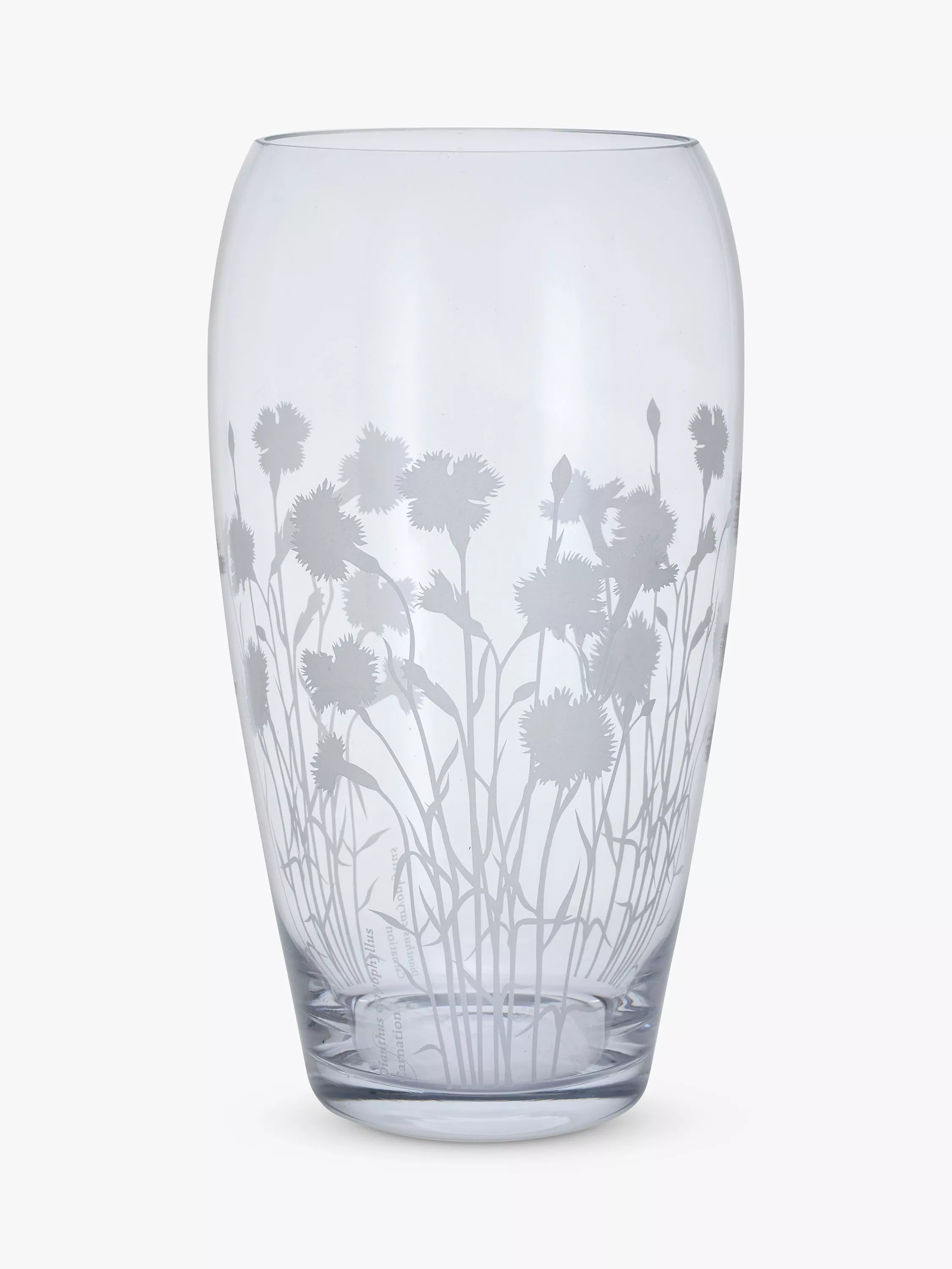 This Dartington Crystal barrel vase is decorated with elegant silhouettes of Dianthus flowers.