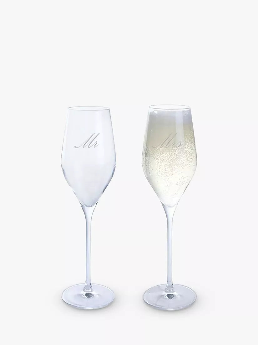 Toast to the happy couple with this set of 'Mr & Mrs' engraved prosecco flutes. Expertly engraved to the highest standard, they make for a cherished gift.