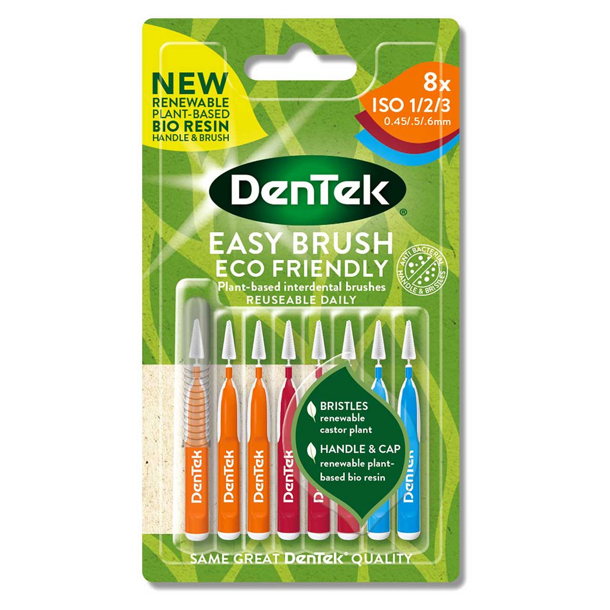 DenTek have gone green! DenTek Easy Brush Eco Friendly Reusable Interdental Brushes are designed to help you clean between your teeth and massage your gums. This multi-sized pack includes 3 x ISO1 (0.45mm), 3 x ISO2 (0.5mm) and 2 x ISO3 (0.6mm) sized brushes, which gives you a variety of brush sizes to clean between teeth for both bigger gaps as well as small/tight gaps between teeth. New to flossing? This is the ideal starter pack to help you identify which size suits your teeth best.