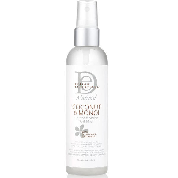 design essentials coconut monoi intense shine oil mist infused with sunflower vitamin e and replenishing moroccan argan oil