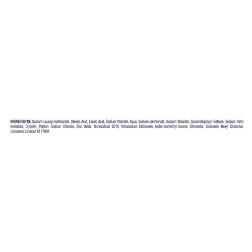 Sodium Lauroyl Isethionate, Stearic Acid, Sodium Stearate, Sodium Palmate, Aqua, Sodium Isethionate, Lauric Acid, Cocamidopropyl Betaine, Parfum, Sodium Palm Kernelate, Sodium Chloride, Glycerin, Tetrasodium Etidronate, Tetrasodium EDTA, Zinc Oxide, Alpha-Isomethyl Ionone, Citronellol, Coumarin, Hexyl Cinnamal, Limonene, Linalool, CI 77891