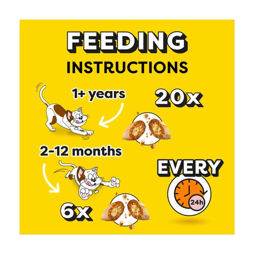 Feeding instructions: For adult cats, feed up to 20 pieces per day. For kittens, feed up to 6 pieces per day.