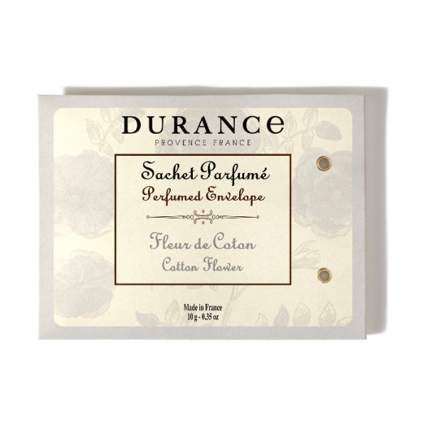 durance perfumed envelope cotton flower 10g luxury french home fragrance delicately scented sachet handcrafted in provence a soft and fresh fragrance inspired by pure cotton blossoms infuse your home with the fresh comforting scent of cotton flower this delicately perfumed envelope releases a soft and airy floral aroma reminiscent of freshly laundered linens drying in the gentle breeze crafted using expert french perfumery techniques it offers a longlasting and natural fragrance bringing a sense of purity and tranquility to any room fragrance profile top notes fresh aldehydes soft citrus a clean and refreshing opening heart notes cotton flower white musk a gentle and soothing floral heart that enhances the comforting scent base notes light woods powdery notes a warm and comforting finish for a balanced and serene ambiance key benefits delicate longlasting fragrance infuses linens clothing and small spaces with a soft fresh scent versatile use ideal for wardrobes drawers suitcases cars or anywhere you desire a pure and calming aroma crafted by expert perfumers developed in collaboration with master perfumers from grasse for an authentic and highquality scent ecofriendly practical made with natural fragranceinfused granules and packaged in a recyclable envelope how to use place the perfumed envelope in your wardrobe drawers or luggage shake lightly from time to time to reactivate the fragrance avoid direct contact with fabrics to prevent staining indulge in the soft and comforting scent of cotton flower and let its fresh and delicate notes bring a sense of purity and tranquility to your home