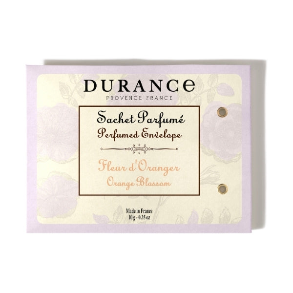 durance perfumed envelope orange blossom 10g luxury french home fragrance delicately scented sachet handcrafted in provence a soft and radiant fragrance inspired by blooming orange blossoms infuse your linens drawers or small spaces with the elegant and luminous scent of orange blossom this delicately perfumed envelope releases a soft floral aroma reminiscent of sundrenched orange trees in full bloom in the heart of provence crafted using expert french perfumery techniques it offers a longlasting and natural fragrance bringing a touch of freshness and sophistication to your home fragrance profile top notes zesty mandarin neroli a bright and uplifting citrusy opening heart notes orange blossom white jasmine a soft and floral bouquet with delicate sweetness base notes musk honeyed woods a warm and comforting finish for a serene ambiance key benefits elegant longlasting fragrance infuses linens clothing and small spaces with a soft and delicate scent versatile use ideal for wardrobes drawers suitcases cars or anywhere you desire a fresh and floral aroma crafted by expert perfumers developed in collaboration with master perfumers from grasse for an authentic and highquality scent ecofriendly practical made with natural fragranceinfused granules and packaged in a recyclable envelope how to use place the perfumed envelope in your wardrobe drawers or luggage shake lightly from time to time to reactivate the fragrance avoid direct contact with fabrics to prevent staining indulge in the radiant and delicate scent of orange blossom and let its floral and citrus notes bring a refreshing touch of provence to your everyday life