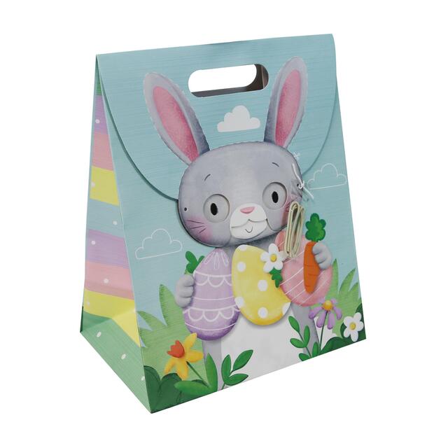 Deliver your gifts in this fun Easter gift bag. Designed with cute Easter bunny character which also includes a cut out Easter mask with elastic string. Bag has a extra wide base which is perfect for boxed Easter eggs.Â