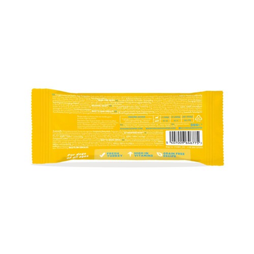 EN Complementary pet food for dogs. Composition: fresh turkey 40%, pea starch, potato flour, vegetable glycerin, potato starch, pumpkin (dried) 0.5%, spinach (dried) 0.5%, minerals. Additives: Nutritional additives/kg: vitamin B1 5 mg, vitamin B12 30 mg, vitamin E 150 mgTechnological additives: antioxidants, preservatives. Analytical constituents: crude protein 12%, crude fat 7.5%, crude fibre 1.5%, crude ash 4%, moisture 20%. Make sure fresh water is available. Keep in a cool, dry place. 315.5kcal/100g. GRAIN-FREE RECIPE.
