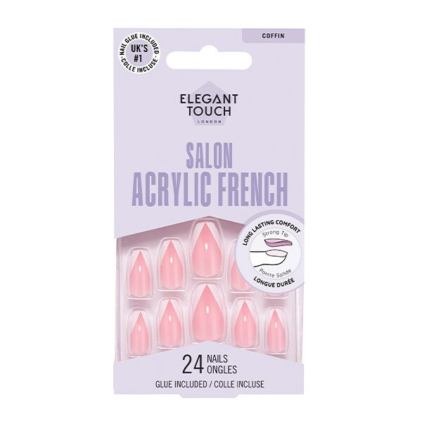 Elevate your classic manicure using the Elegant Touch Acrylic French No 6 set. These nails feature a pointed coffin shape designed to create an elongated, classy look. This kit offers an alternative to traditional French styling for a modern effect.