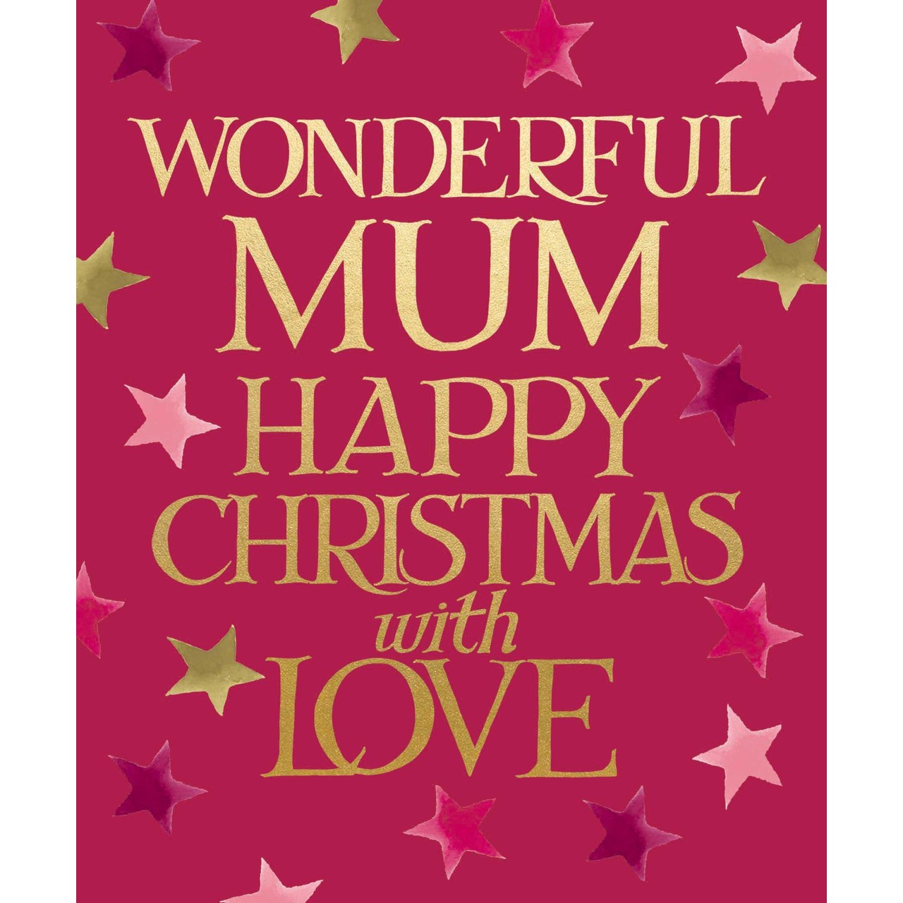 This Emma Bridgewater Christmas card is specifically designed to celebrate your mother during the festive season. It showcases prominent, metallic gold lettering reading "Wonderful Mum" set against a vibrant pink background filled with colourful stars. The card package includes a matching, recyclable envelope, simplifying preparation for gifting.