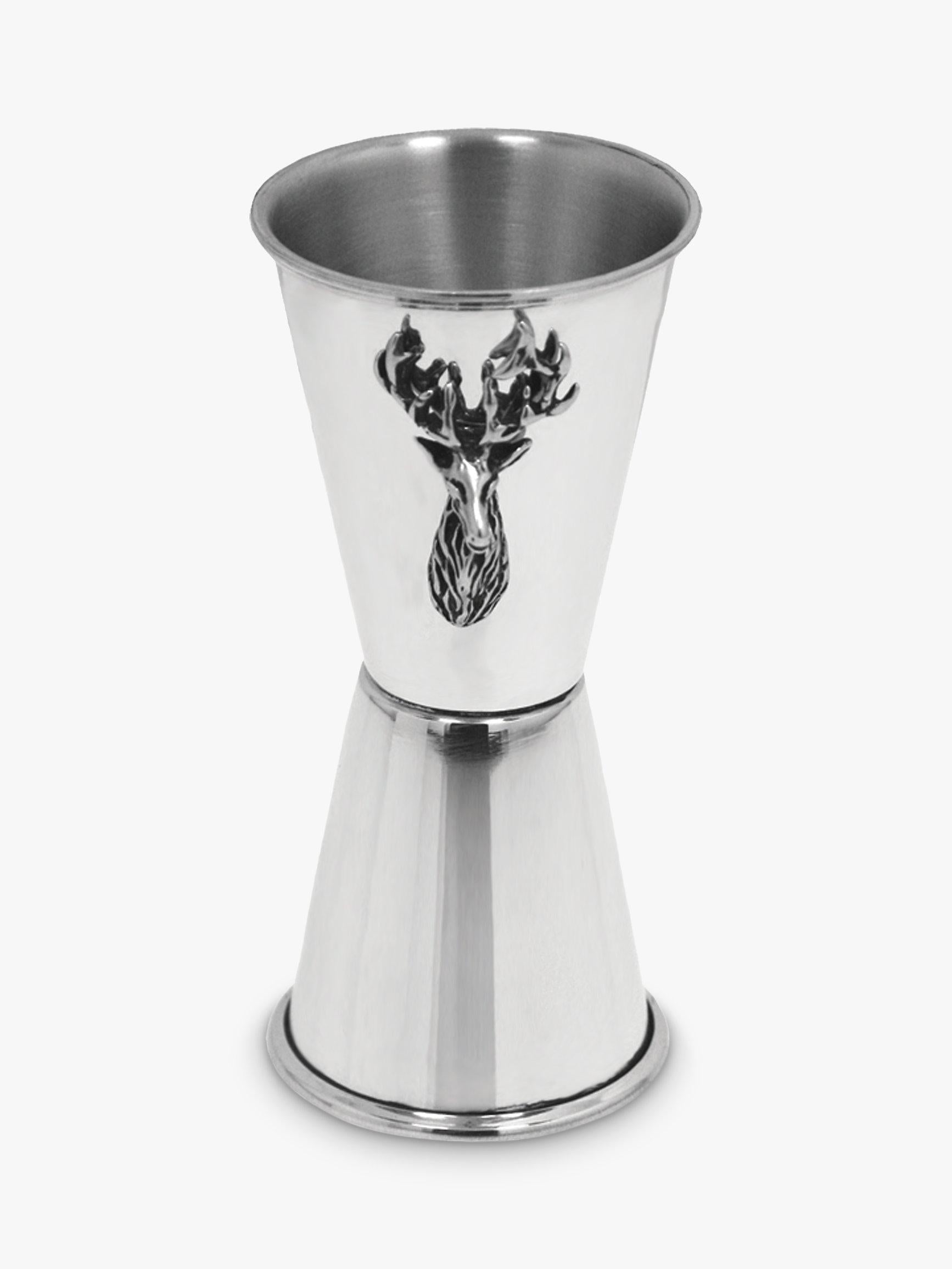 The English Pewter Company Stag Head Spirit Measure provides precise double measurements of 25ml and 50ml for accurate pouring of spirits. This elegant pewter barware item showcases superior British craftsmanship, making it a distinguished accessory for any drinks service. It is designed for durability and aesthetic appeal during home entertaining tonight.
