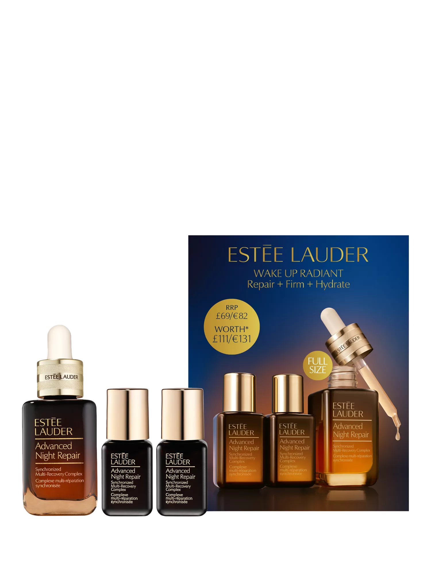 Wake up radiant with this night-time skincare gift set, featuring a full-size Advanced Night Repair Serum, plus two deluxe travel sizes for a glow boost on the go.