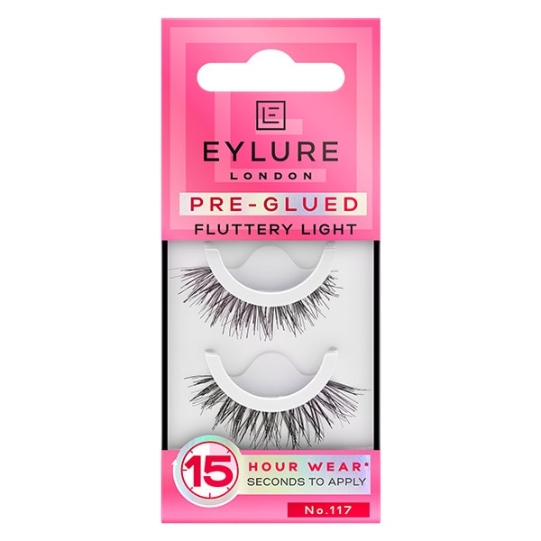 the texture no117 preglued lash is a messedup gorgeous lash that will lightly and beautifully elongate your eye a wispy classic with no glue no mess no stress the new formula preglued band has been created to last longer than all other preglued lashes with a guaranteed 15hour wear go from desk to dancefloor in a flash with the eylure preglued lashes the lashes all have a cushioned band that create a comfortable wear whilst the black lash band gives a builtin eyeliner look get lashed in 15 seconds stay lashed for 15 hours