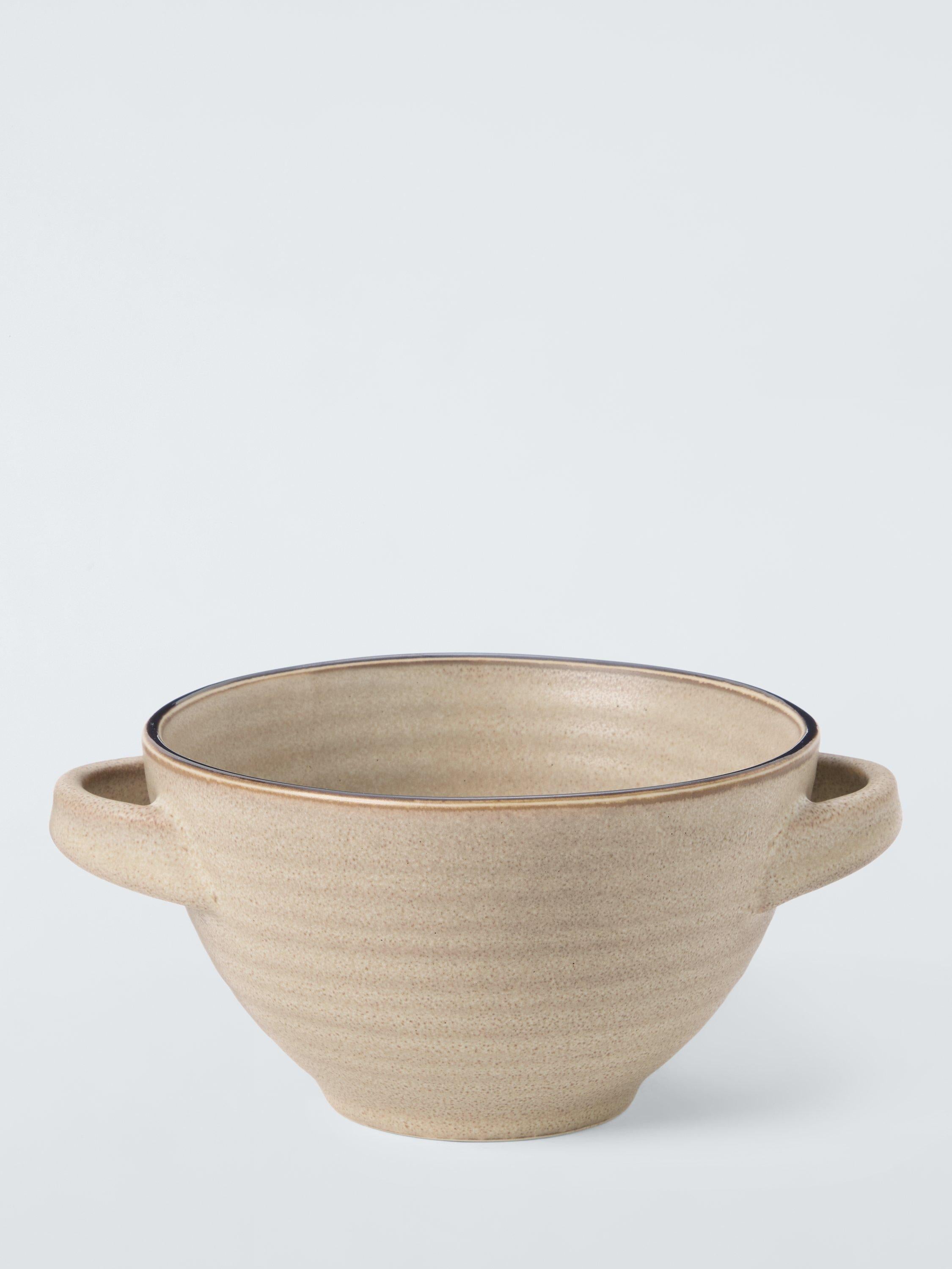 The John Lewis Farmhouse Soup Bowl is 16cm wide, offered in a calming Sand colour, perfect for everyday meals now. Its distinctive reactive glaze ensures that each piece has a truly unique look, setting it apart from mass-produced china items immediately. This durable stoneware is fully microwave and dishwasher safe.