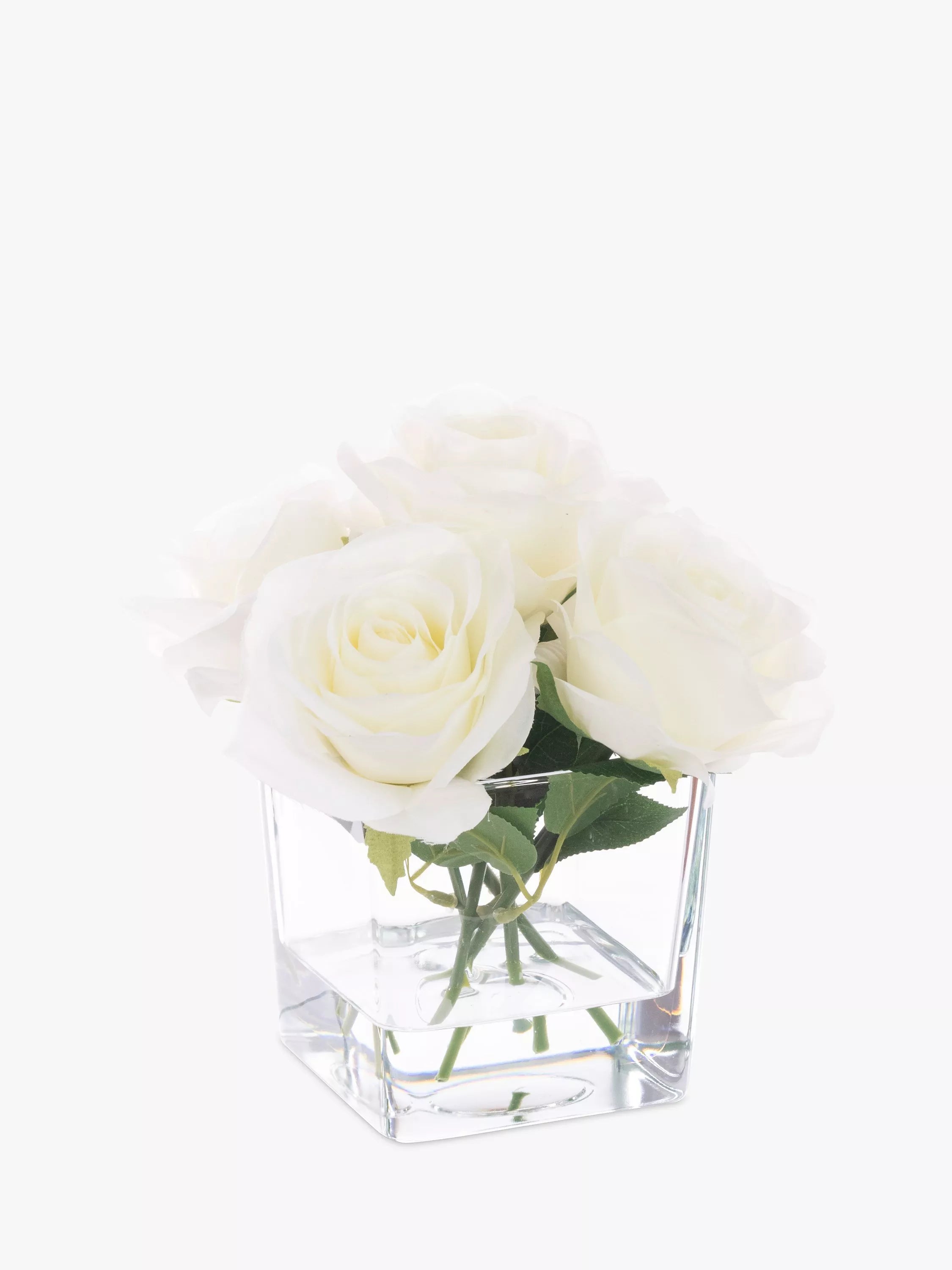Enjoy the timeless beauty of roses without the upkeep! This stunning artificial rose arrangement in a cube vase adds a touch of elegance to any space.
