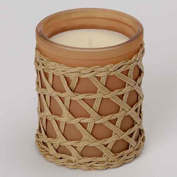 the tan ceramic container with woven outer detail holds a beautiful cedarwood citrus scented candle to not only make a statement in your home but to fill your home with a stunning aroma to make your guests envious 1wick scented candle medium size material above 51 shea butter wax fragrance percentage 10 wax weight 200g 1 candle per pack w bamboo weaving