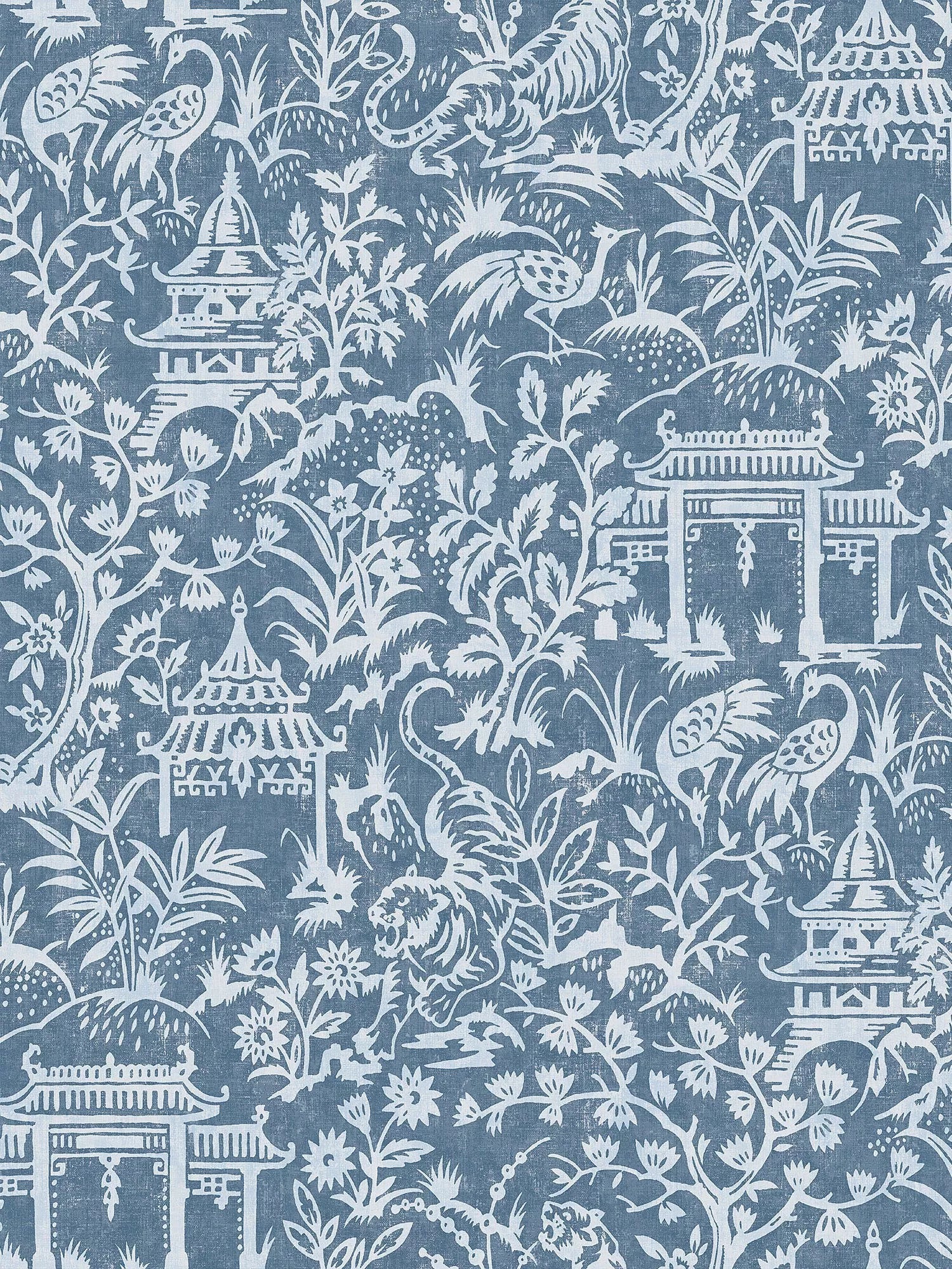A fantastical wallpaper that reflects the 1970s fashion for exotic patterns and global cultures. Representative of a garden in the Far East, this oasis scene of floral sprigs, stylised trees, tigers and birds has been designed in a woodblock style effect to give it a time-worn look.