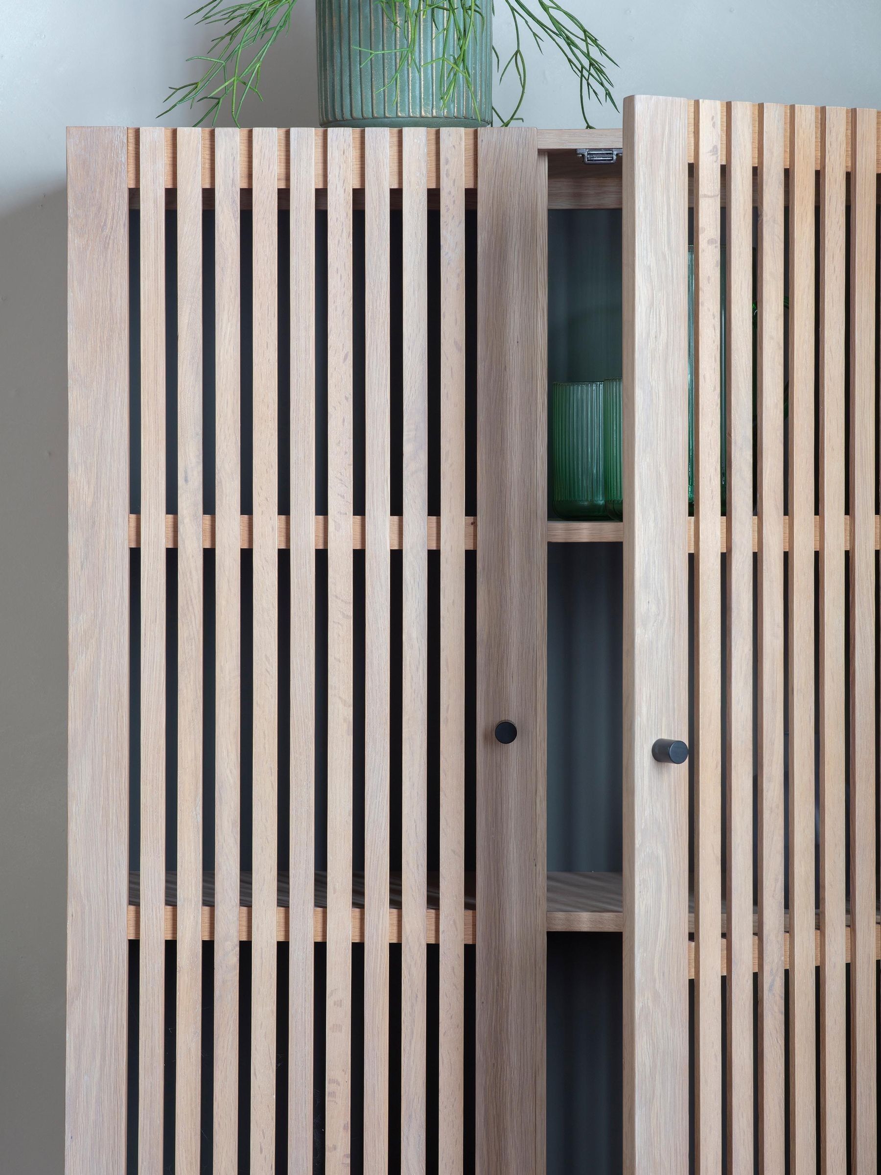 This unique collection offers a range of living, dining and bedroom furniture with a beautiful contemporary Japandi style. Crafted from solid oak and oak veneers, great attention to detail has been given to the design across the range to create these stunning pieces. This 2 door cocktail cabinet features beautiful, slatted doors, crafted from solid oak. Black metal legs and base with matching handles add the finishing touch.