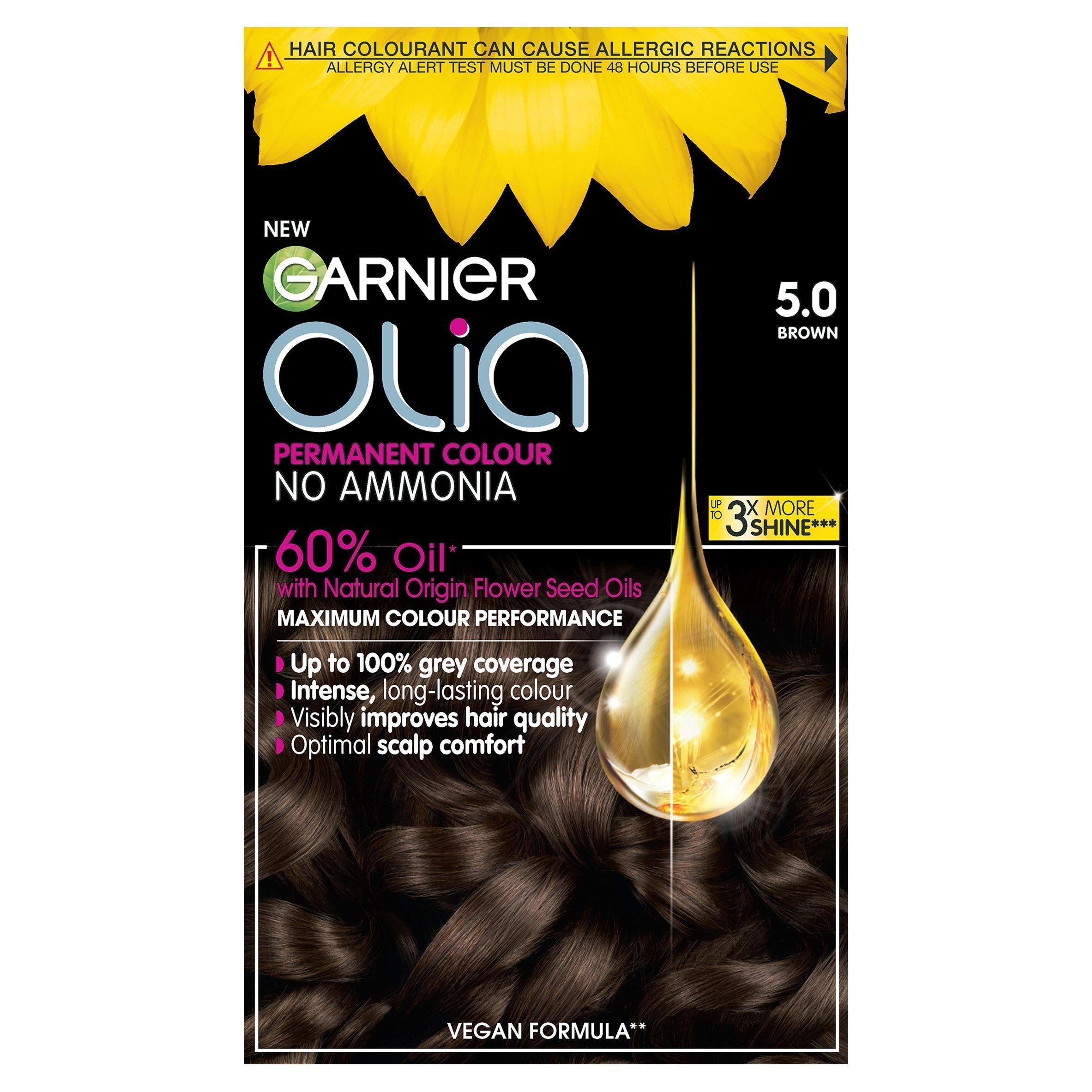 Dare to colour with Garnier Olia No Ammonia Permanent Hair Dye. Our 60% oil-powered formula*, with Natural Flower Seed oils and no ammonia, delivers maximum colour performance for exceptional ultra-luminous, long-lasting dark hair with beautiful multi-dimensional undertones and up to 100% grey coverage. The vegan formula** leaves hair is smoother, free flowing with up to 3 times more shine*** Olia home hair colour has a unique sensorial application with our non-drip smooth velvety texture of the colourant cream. * In the colour cream, ** No animal derived ingredients, *** Instrumental test vs unwashed hair.