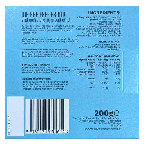 This Gluten Free Kitchen tart features savoury sliced red onions combined thoughtfully with a rich, creamy filling. The filling contains both sharp goat’s cheese and smooth goat's milk, offering a distinctive flavour profile for your meal. All components are held securely within a satisfyingly crisp shortcrust pastry shell for an enjoyable bite.