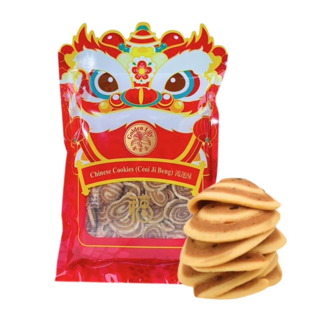 Golden Lily Chinese Cookies (Ceoi Ji Beng) are a classic Chinese biscuit known for their crumbly texture and light sweetness. Made with simple ingredients like flour, sugar, and a touch of shortening or lard, these cookies are shaped into discs and baked to a beautiful golden brown. Perfect for pairing with tea or coffee, Ceoi Ji Beng offers a nostalgic taste of traditional Chinese baking, often enjoyed during festive occasions or as an everyday snack. Their delicate and rich flavour makes them a timeless favourite for all ages.