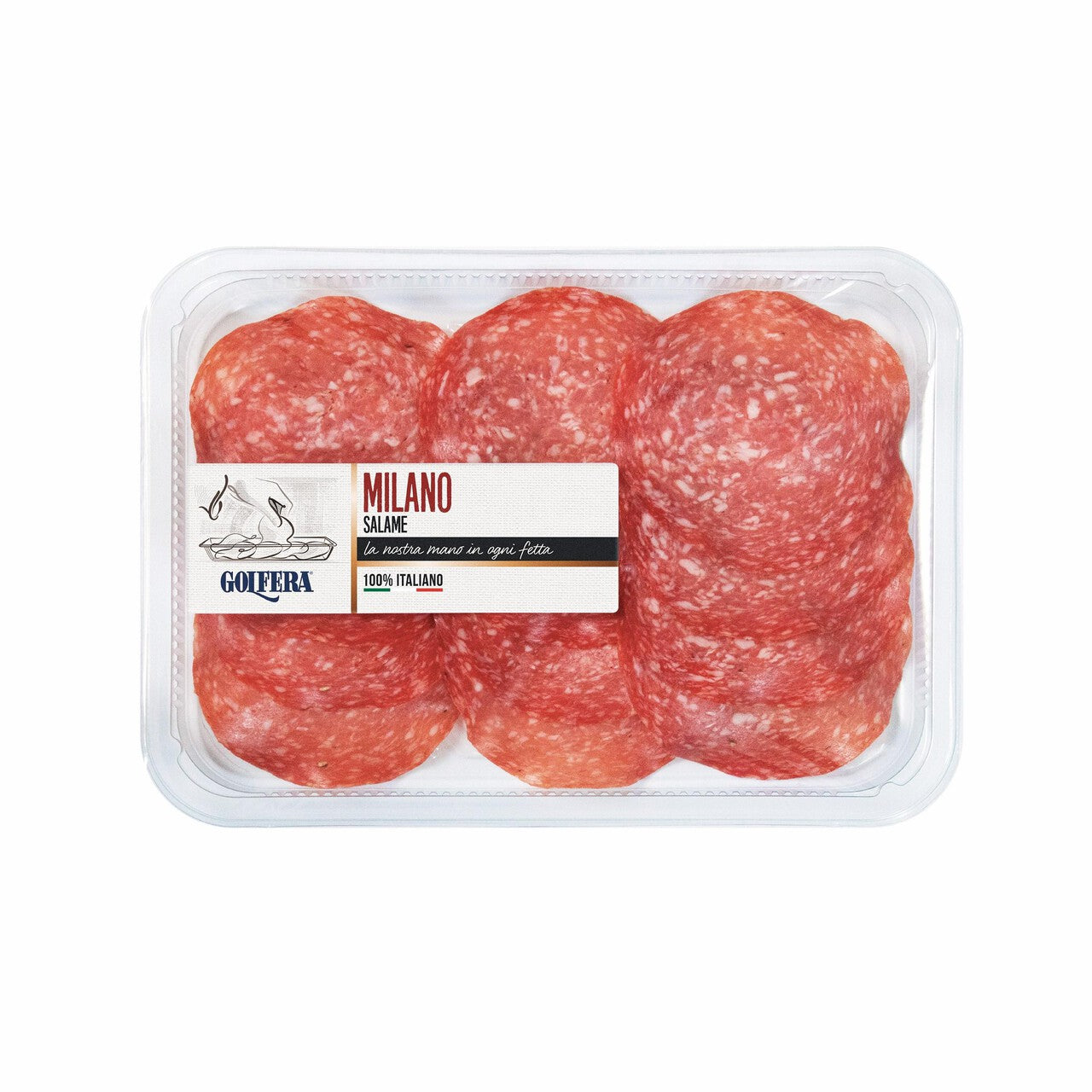 Golfera Italian Milano Salami is a renowned cured meat originating from the Lombardy region with Renaissance roots. This traditional preparation features a characteristic 'rice grain' dough structure. Its flavour profile is sweet and delicate, balanced by a strong, harmonious aroma.