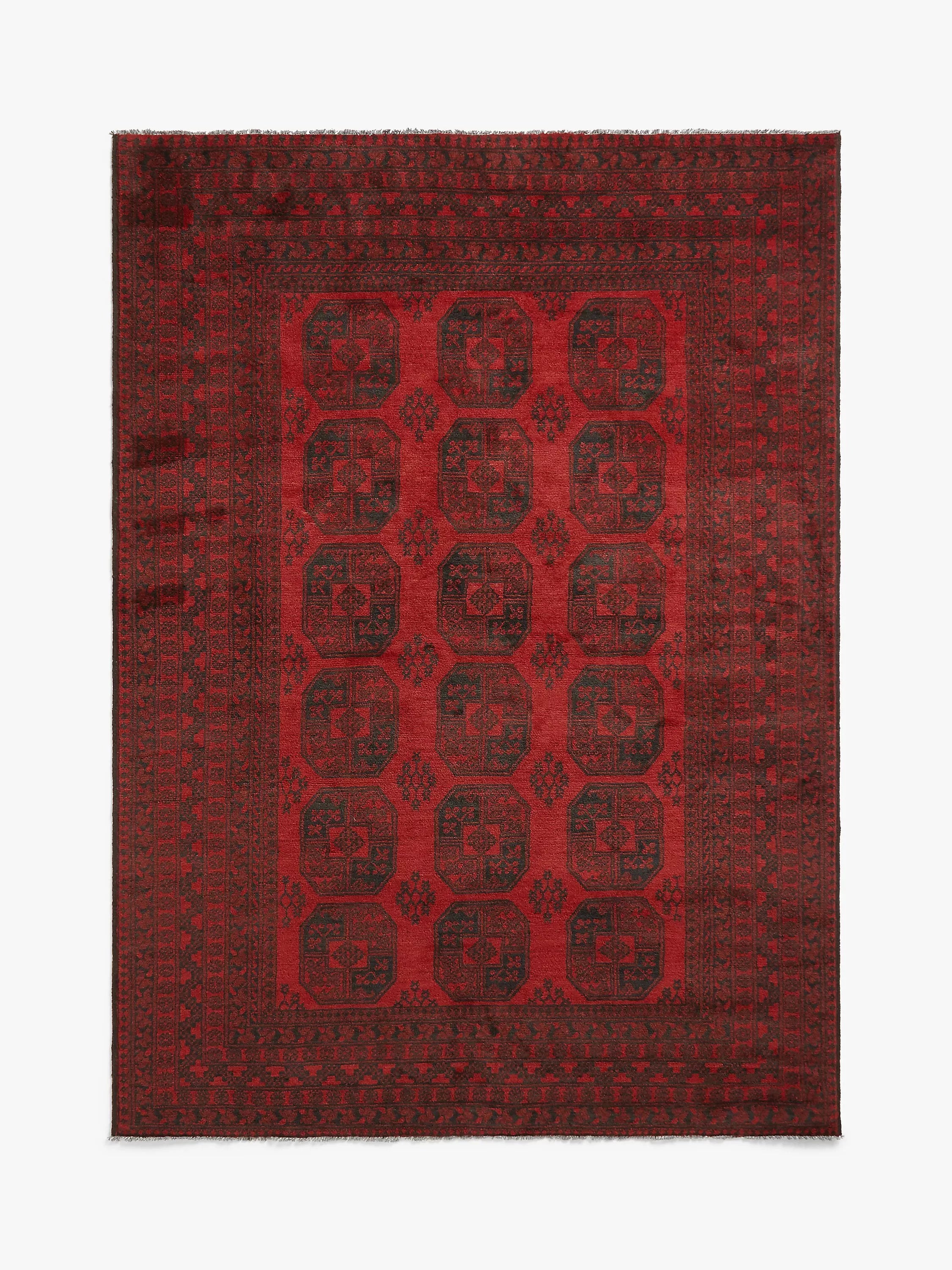 The Red Afghan rugs, also known as Aqchae are made in the classic Afghan-style using two shades of red with a black or very dark blue pattern.