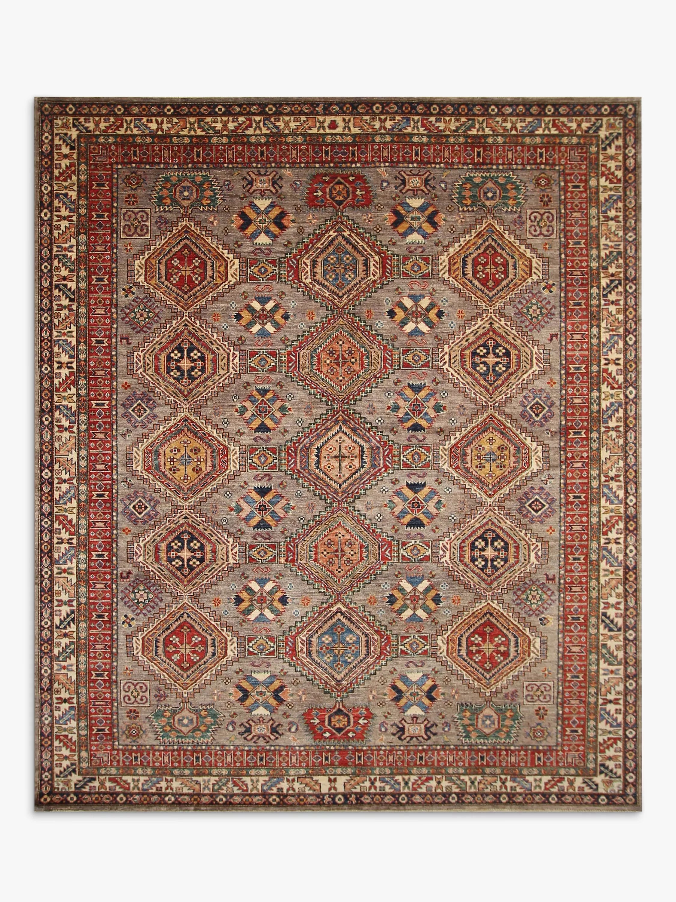 The wool yarns used are all hand spun and dyed using only natural dyes such as cochineal and indigo, which adds to their dramatic and vibrant appearance. Once dyed and hand knotted on a cotton warp base in Afghanistan the rugs are then transported over to Pakistan where they are expertly finished including washing and trimming. The method used to hand make a Kazak rug is called ChappatBaft or Flat woven. Kazak rug weavers are faithful in using traditional bold colour and design mainly with geometrical motifs including a mixture of diamond and circle shapes as well as representations of animals, people and nature.