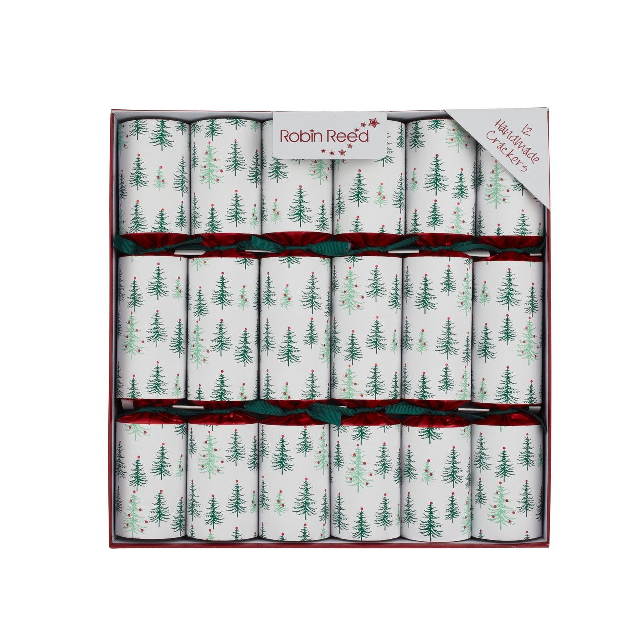 These handmade Christmas crackers are designed to bring sophisticated detail to your seasonal celebrations. They feature an elegant tree scape illustration, perfectly complementing a modern holiday setting. The packaging contains a selection of these carefully crafted items, ready to adorn your dining arrangement.