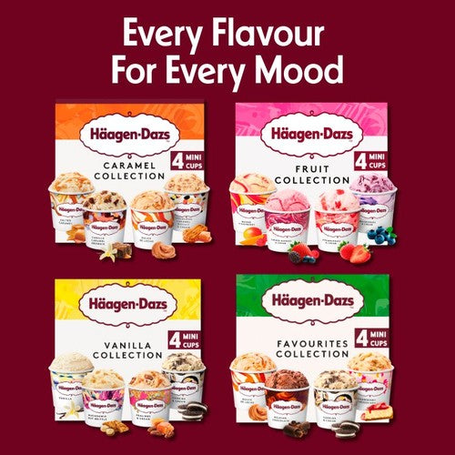 This Häagen-Dazs Minicup Collection offers four distinct 95ml servings of premium ice cream indulgence. Enjoy the variety of established, rich flavours designed for satisfying individual moments. This assortment allows for sampling several signature recipes without committing to a large tub.