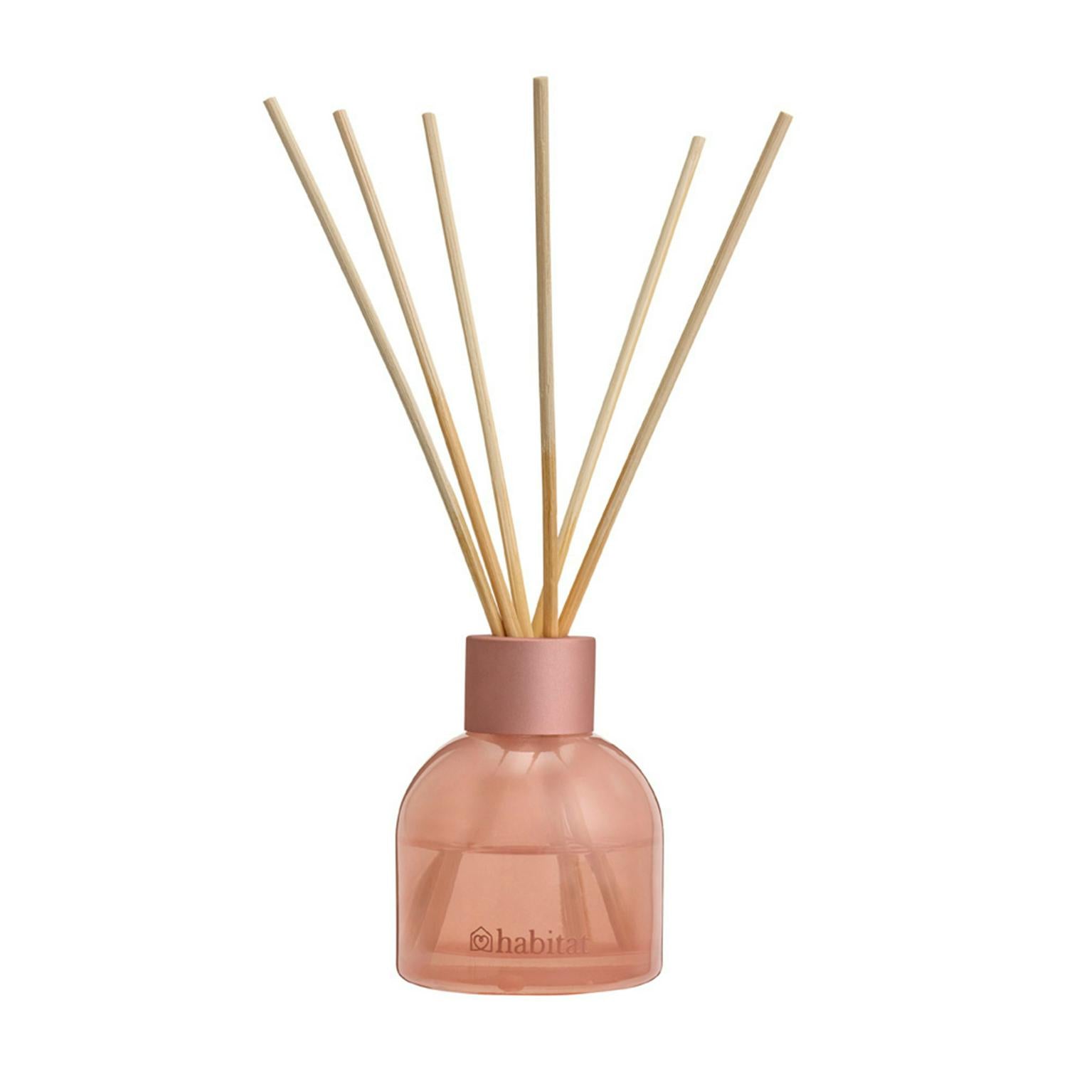 This Habitat diffuser is designed to instantly create a relaxing ambience in any room. It features a delicate blend of floral peony notes layered with warm white amber. The fragrance is presented within an attractive pink glass bottle, adding a subtle decorative touch to your space.