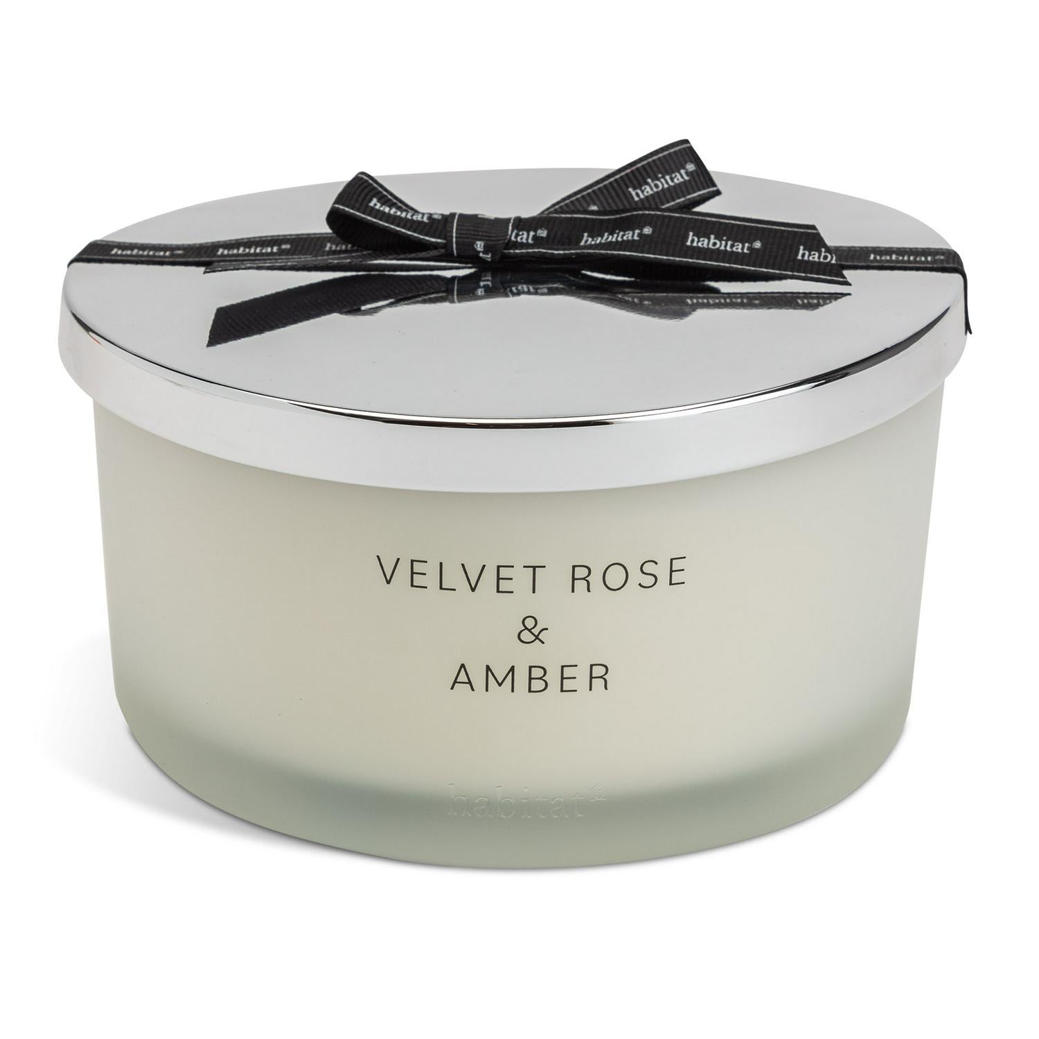 This Habitat Luxe scented candle features the warm and decadently sweet fragrance profile of Velvet Rose and Amber. It is presented within a sophisticated frosted glass holder, complete with a silver lid and an accompanying black bow. This large 700g candle is specifically designed to provide a consistent, pleasing aroma for many hours of enjoyment.