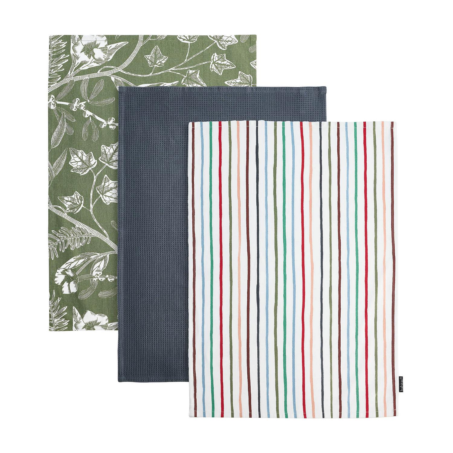 Read MoreDelicate floral elegance. This coordinated set of 3 absorbent cotton tea towels is patterned with painterly wildflowers in a soft monochrome green. Balanced with stripes and textured weave, it brings a graceful touch to everyday kitchen tasks.