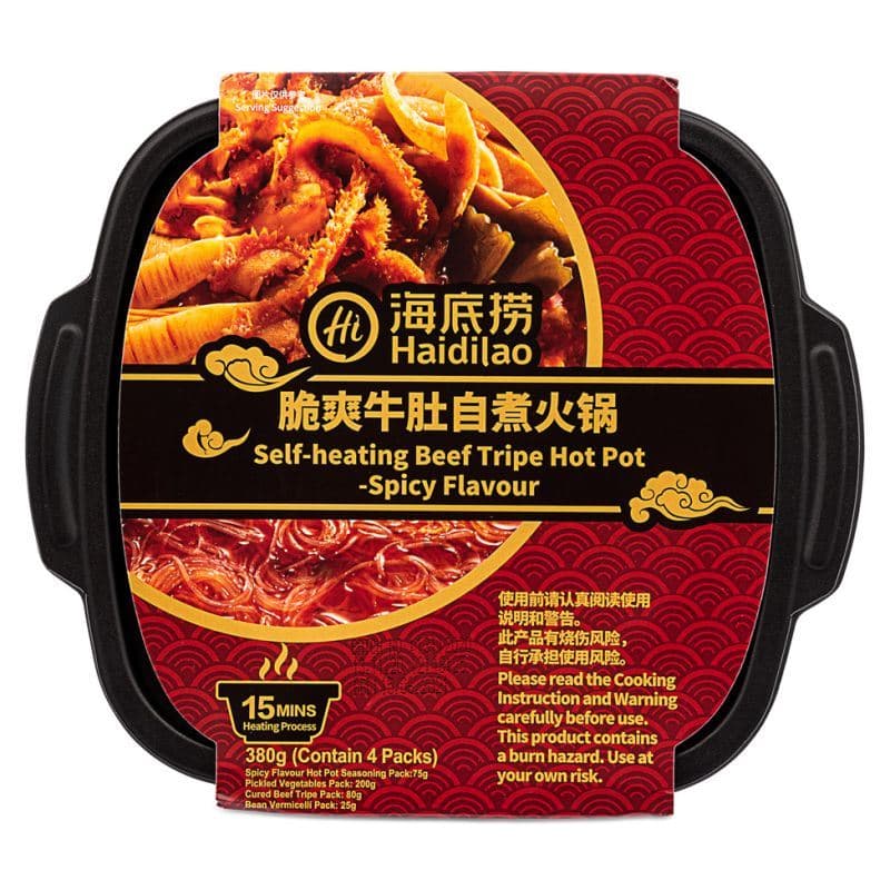 Experience the convenience and exquisite flavours of Haidilao Self-Heating Spicy Hot Pot with Beef Tripe. This convenient kit brings the renowned Haidilao hot pot experience to your home, ready in just 15 minutes. Indulge in the crisp and tender texture of beef tripe, complemented by the rich flavours of pickled vegetables and savoury beef tripes with vermicelli. With this self-heating hot pot, you can enjoy the authentic taste of Haidilao's signature dish without leaving your home. Simply unwrap, heat, and savour the deliciousness at your own pace.