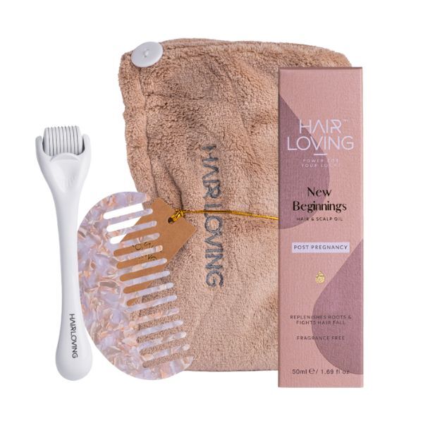 4-Step Postpartum Hair Renewal Kit! Heal damaged hair naturally. Castor & jojoba oils restore thickness. Contains oil, towel wrap, derma roller, de-tangling comb. Tackle hair shedding, boost growth.