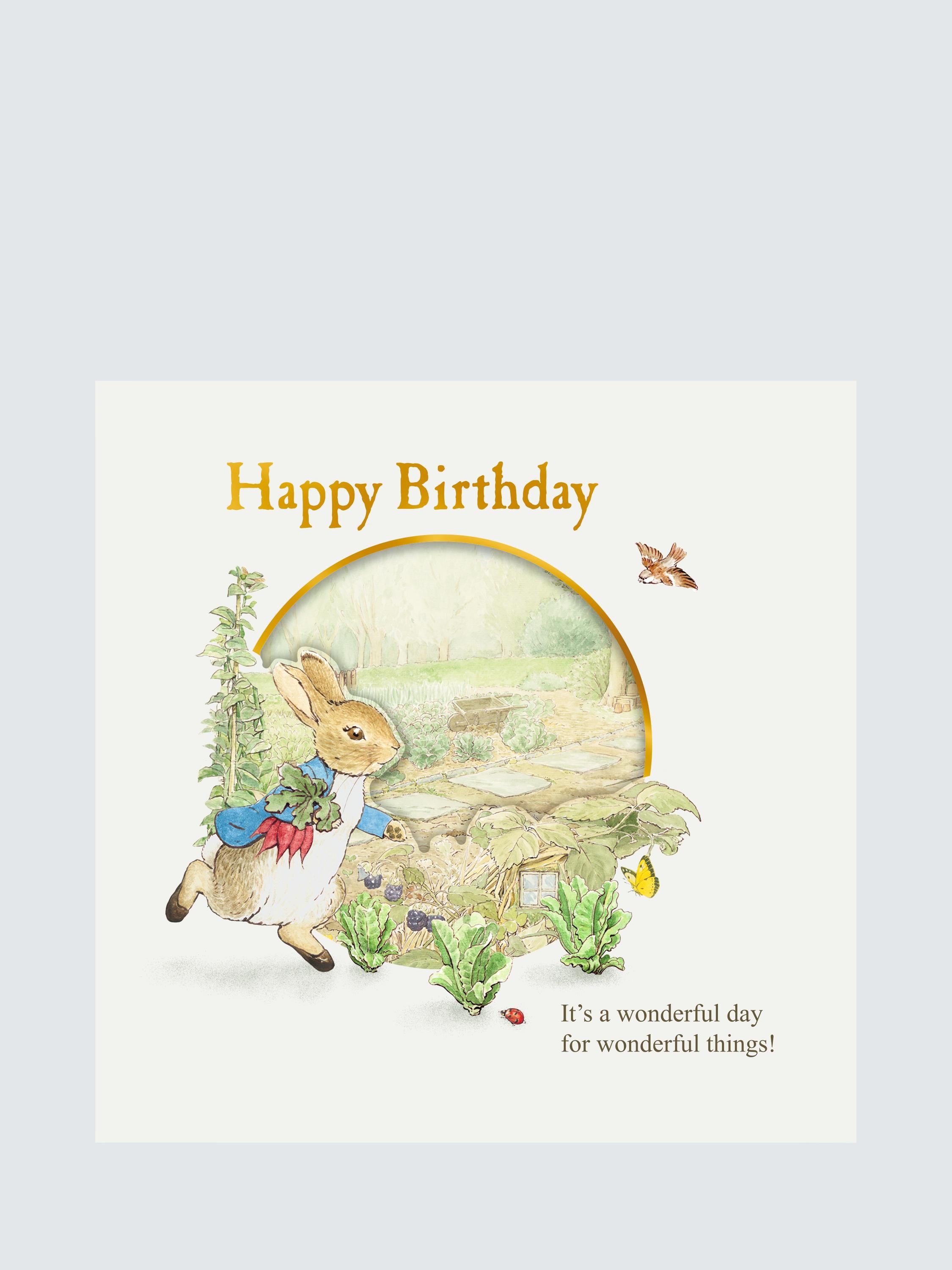Hallmark Peter Rabbit Radishes Birthday Card offers joyful greetings suitable for any special birthday celebration. This certified greetings card displays beloved Beatrix Potter artwork. It arrives complete with a matching brown envelope for immediate posting. This lovely item avoids glitter usage entirely.